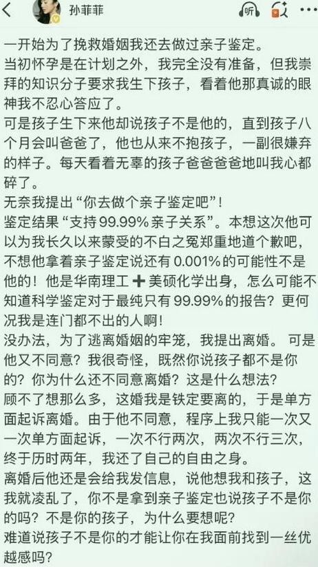 2025年9月,孙菲菲勇敢站出来揭露家庭隐痛。她透露,孩子出生后,丈夫竟怀疑非亲生,即使亲子鉴定结果显示匹配度高达99.99%,对方仍拒不接受,坚称“剩下0.01%也可能是别人的孩子”。